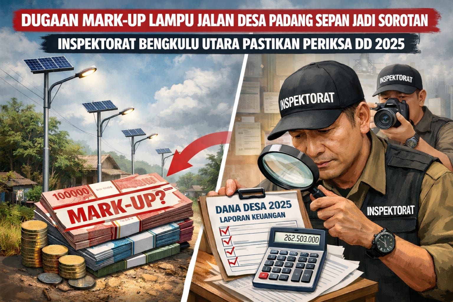 TNews, Bengkulu Utara – Dugaan praktik mark-up anggaran mencuat dalam proyek pengadaan lampu jalan tenaga surya di Desa Padang Sepan, Kecamatan Tanjung Agung Palik (TAP), pada tahun anggaran 2025. Proyek tersebut diketahui menelan anggaran sebesar Rp262.503.000 untuk pemasangan 30 unit lampu jalan di beberapa titik desa.