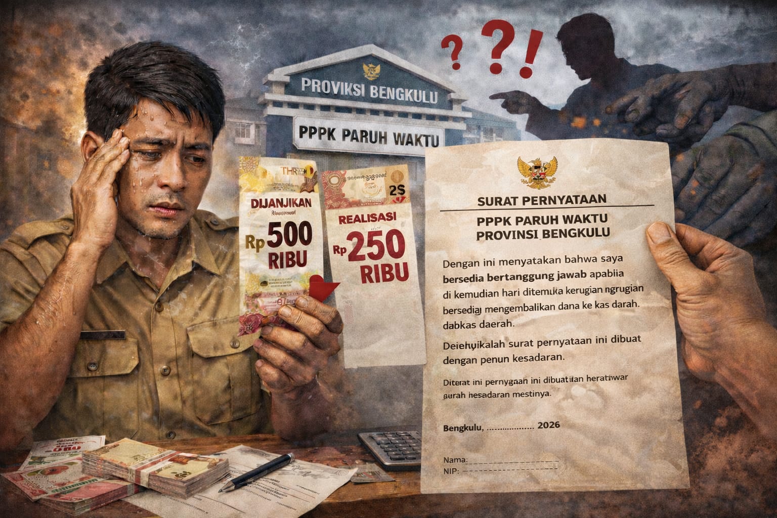 Kekecewaan semakin bertambah setelah beredarnya format surat pernyataan yang mewajibkan penerima THR bertanggung jawab apabila di kemudian hari ditemukan adanya kerugian negara. Bahkan, dalam dokumen tersebut, pegawai diminta bersedia mengembalikan dana ke kas daerah. Surat itu disebut merujuk pada Keputusan Gubernur Bengkulu Nomor 3 Tahun 2026. Kondisi ini memunculkan dugaan adanya tekanan administratif yang tidak transparan dan berpotensi dijadikan legitimasi atas pemangkasan hak pegawai.