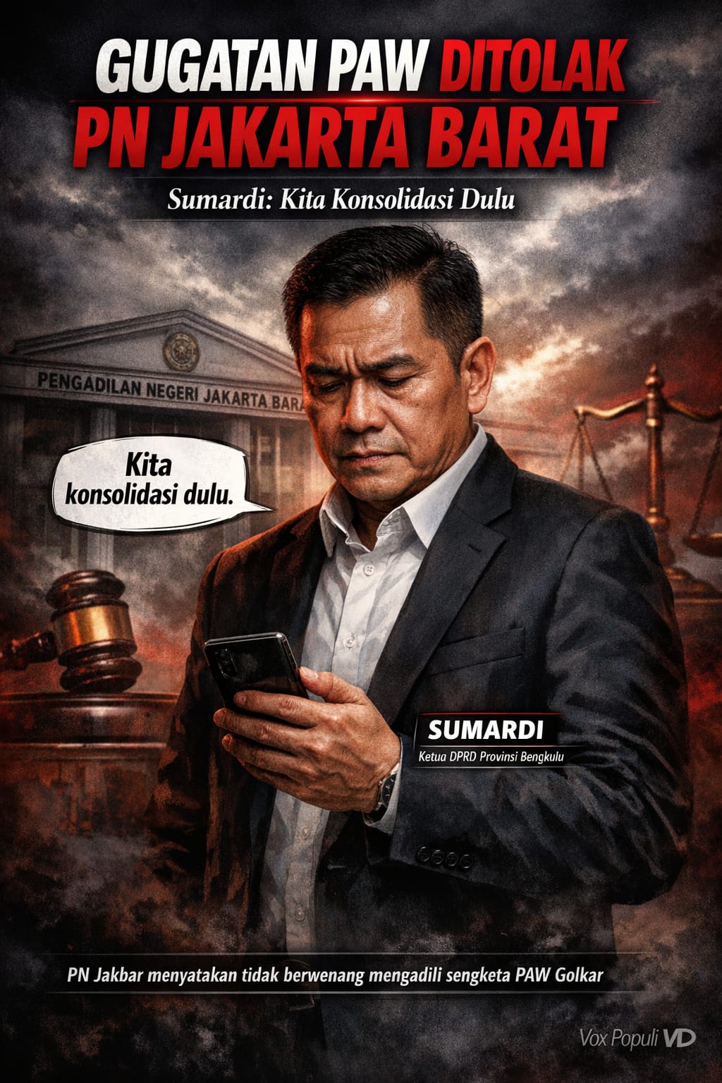 TNews, BENGKULU – Pengadilan Negeri Jakarta Barat resmi menolak gugatan Ketua DPRD Provinsi Bengkulu, Sumardi, terhadap Keputusan DPP Partai Golkar Nomor B-798/DPD/Golkar/X/2025 tentang persetujuan Pergantian Antar Waktu (PAW) pimpinan DPRD Provinsi Bengkulu sisa masa jabatan 2024–2029. Mu