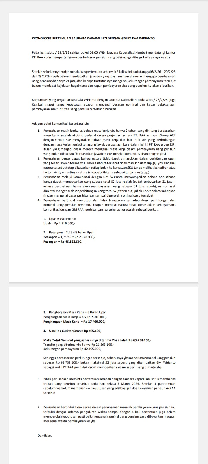 Menurut Kaparallazi, pihak manajemen melalui General Manager menyebut kekurangan pembayaran hanya sekitar Rp30 juta. Namun hasil perhitungan ulang menunjukkan angka yang jauh lebih besar.