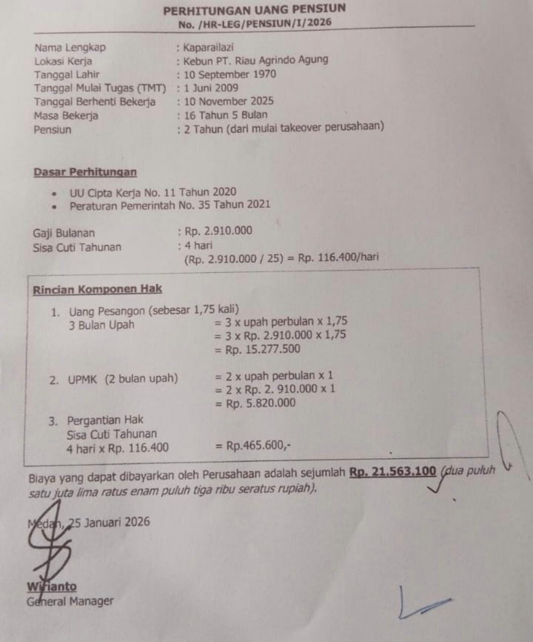 Sorotan publik kini mengarah kepada General Manager perusahaan, Wirianto, menyusul beredarnya dokumen resmi perhitungan pensiun yang memuat tanda tangannya namun justru memunculkan sejumlah kejanggalan serius.